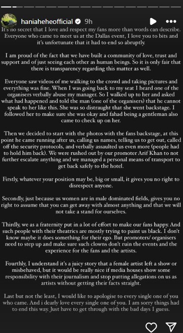 “I love you to bits, but it’s unfortunate that it had to end so abruptly,” Hania wrote, explaining the circumstances. She revealed that while heading to the stage after taking pictures with fans, she overheard a man verbally abusing her manager. Concerned, she confronted the organizer, saying, “You cannot speak to her like this.” However, the situation escalated when the organizer began calling them names and even called off the security protocol.