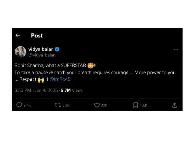 Bollywood actress Vidya Balan has addressed speculation surrounding a tweet she posted praising Indian cricketer Rohit Sharma. The tweet, which lauded Rohit for stepping back from the final match of the Border-Gavaskar Trophy, has drawn accusations of being a public relations (PR) move.