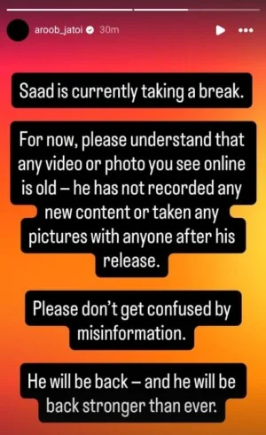 Addressing this issue, his wife Aroob has now shared the first statement. She posted a picture while holding Ducky Bhai’s hand and later shared a statement. She said that Saad is currently taking a break. For now, please understand that any video or photo you see online is likely outdated – he has not recorded any new content or taken any pictures with anyone since his release. Please don’t get confused by misinformation. He will be back- and he will be back stronger than ever.