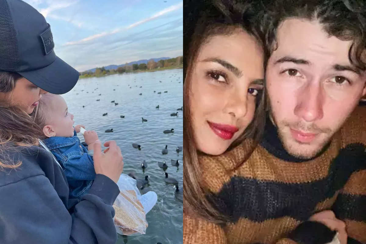 In their selfie, she is wearing a red sweater, while Nick is wearing a brown and black striped jumper. The the next photo shows Priyanka holding her daughter. The mother and daughter are seen enjoying together beside a lake.