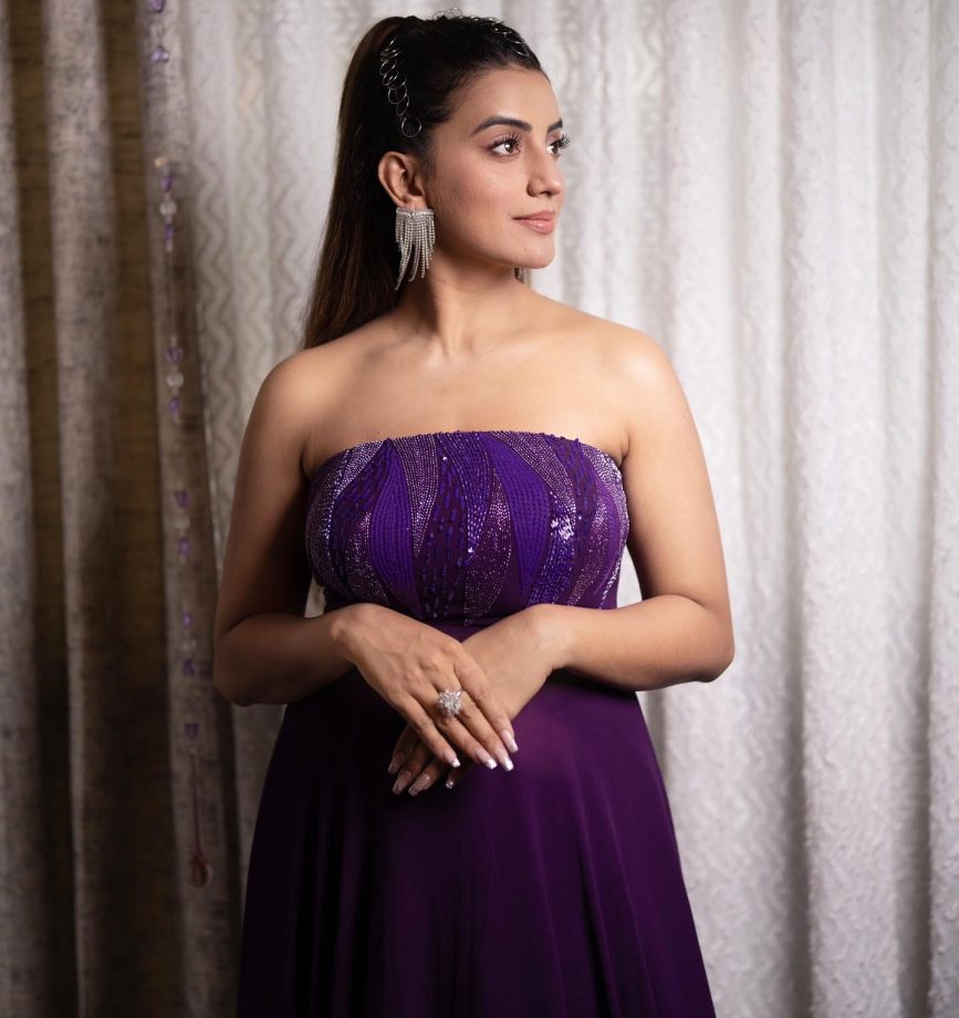 Sharing new pictures on her social media platforms, the diva showcases her fashion prowess. Donning a gorgeous strapless purple gown adorned with sparkling sequin embellishments from the brand Sasya, she exudes elegance and charm. Her impeccable styling, including a high ponytail, winged eyeliner, rosy cheeks, diamond earrings, and nude lips, complements the overall look. Her simple yet beautiful gown gives her a princess-like aura, making it suitable for various occasions such as parties and weddings.