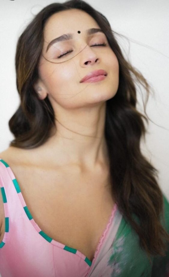 Alia embraces cultural pride with a black bindi, adding a touch of tradition and spirituality to her look. Her wavy, open hair cascades gracefully, framing her face in an enchanting way. The combination of wavy hair and the black bindi strikes a balance between tradition and modernity, showcasing Alia’s ever-evolving style.