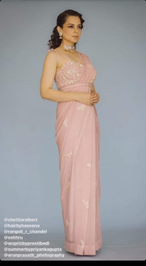 Kangana complements the beautiful soft pink printed saree with a modern-style bustier blouse from the label Summer By Priyanka Gupta. In this pink ensemble, she effortlessly balances both grace and glamour, seamlessly merging ethnic and Western elements.