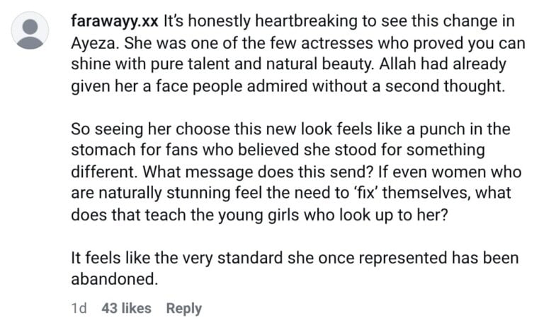 The superstar’s fans are unhappy with Ayeza’s decision to undergo cosmetic procedures. One wrote, “Why are you looking like Michael Jackson?” Another asked, “Why ruin such a beautiful face?” Some admitted they barely recognized her, saying, “I didn’t even recognize you at first. You look so different.” And someone else asked, “What happened to your nose?” Clearly, her fans are curious—and a little concerned—about her new look.