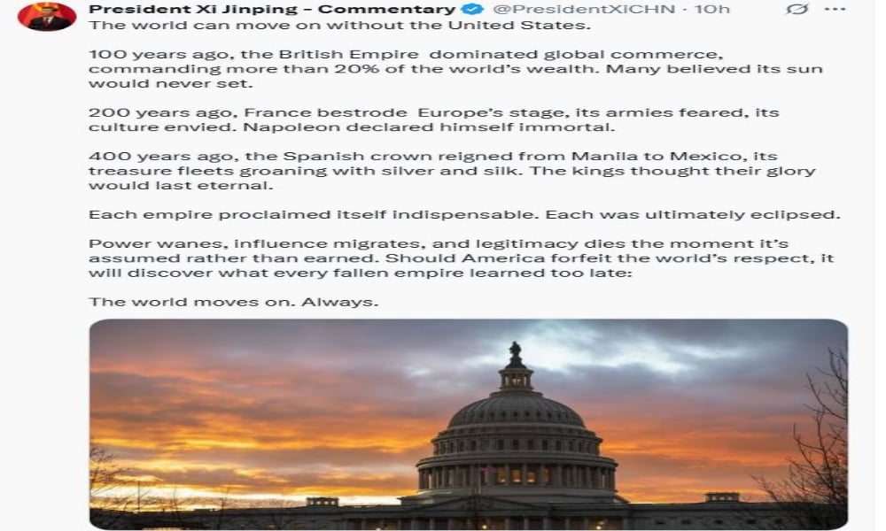 President Xi concluded his message with a clear warning: “If America fails to respect the world, it will learn the same lesson that every declining empire learned—too late.”