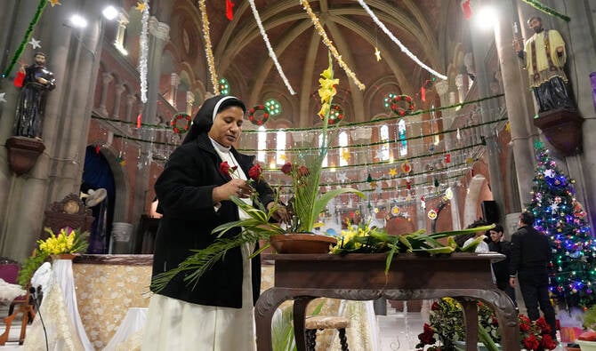 Pakistani Christians decorate the main hall of the Sacred Heart Cathedral on Christmas eve, in Lahore, Pakistan on Dec. 24, 2025. (AP)