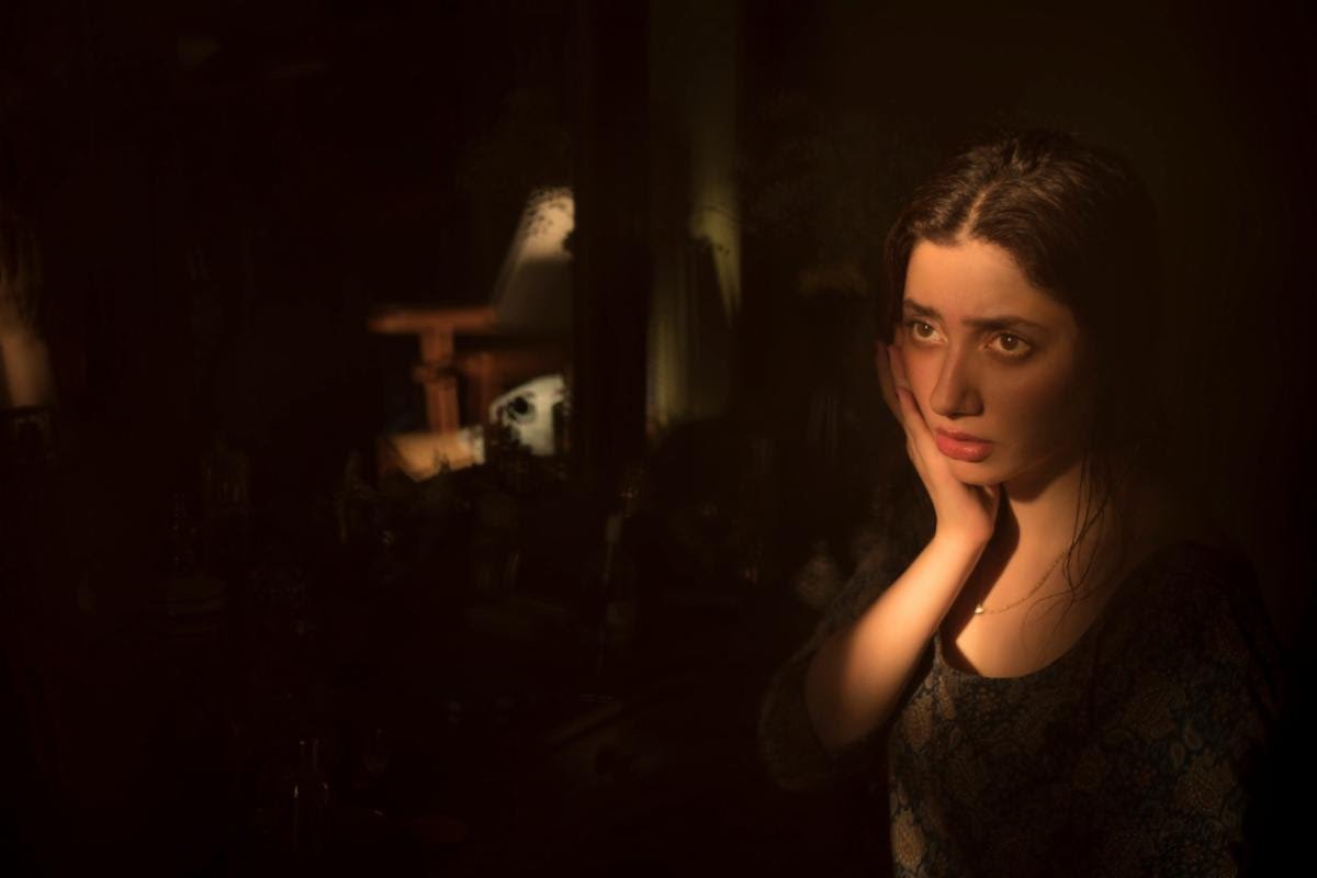 Hair tied up in a messy bun, no-make-up and basic Kameez Shalwar portrays Mahira as a typical housewife who is occupied with work and struggling between her dreams and reality. Her eyes are always on her husband if she is seeking love from Akbar or she is hiding something from him. Her eyes are speaking of melancholy, wait and sometimes they are wandering. She finally finds an escape from the constant chattering mind and chaos surrounding her, she encounters her prince charming. He is the one praising her beauty, his gentle touch makes her tremble, and she must go back to her husband when he calls her name. One would be bewildered when one sees the shadow to whom Sherezad is talking when alone, looking almost like her husband, Akbar. She seems to enjoy the necessary break from her tedious routine; laughing, hugging and shying from him.