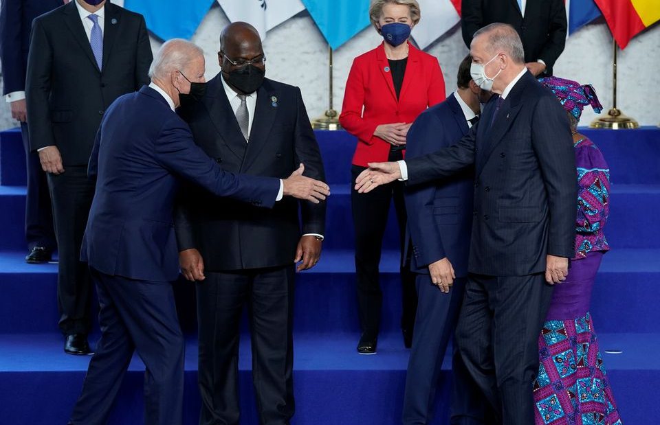 U.S. President Joe Biden reaches out to shake hands with Turkey’s President Recep Tayyip Erdogan during a group photo at the G20 summit in Rome, Italy October 30, 2021. Evan Vucci/Pool via REUTERS