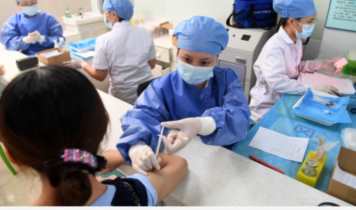 A medical worker administers a dose of COVID-19 vaccine to a citizen at a community health center in Qingxiu District of Nanning city in China. Image: Xinhua