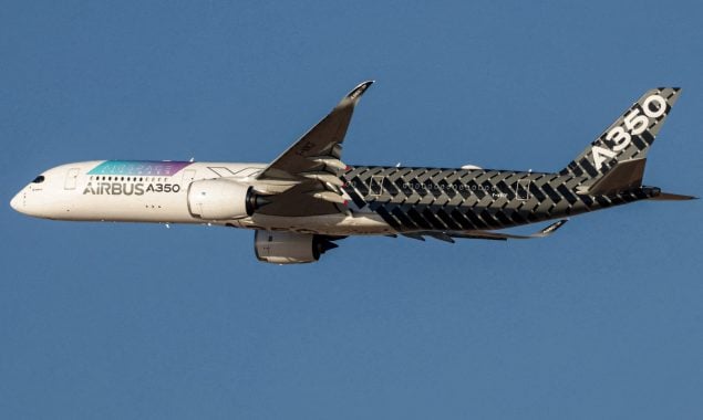 An Airbus A350 XWB aircraft performs a demonstration flight at the 2021 Dubai Airshow in the Gulf emirate on November 14, 2021. Photo: AFP