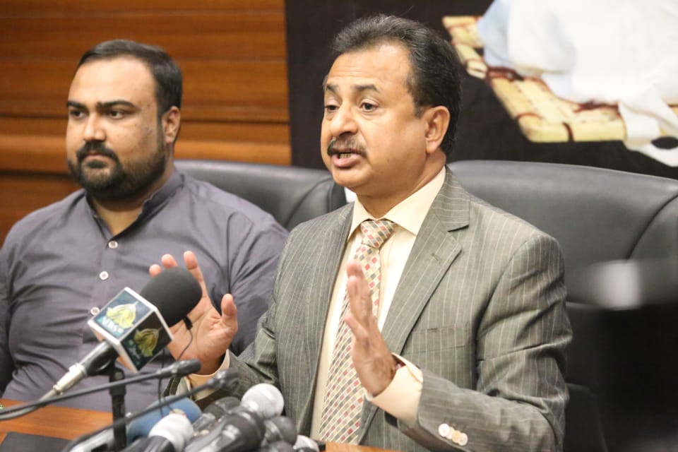 Opposition Leader in the Sindh Assembly Haleem Adil Sheikh addressing a press conference in Karachi. Photo: Athar Khan/Bol News