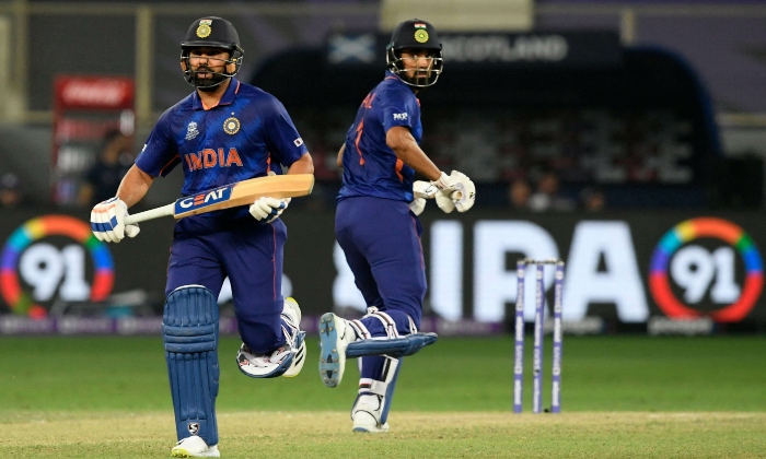 India’s Rohit Sharma (L) and KL Rahul run between the wickets during the ICC men’s Twenty20 World Cup cricket match between India and Scotland. Image: AFP