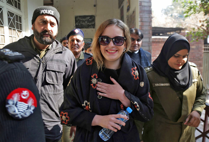 Police officers escort Tereza Hluskova, a Czech citizen, to a court in Lahore, Pakistan. Photo Courtesy: Arab News