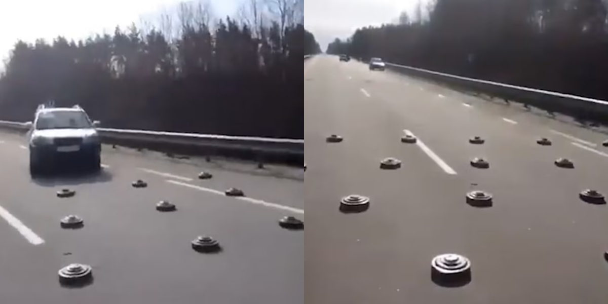 It is unknown how the mines were discovered. The little circular devices are low on the road, and any speeding car might simply drive right into them.
