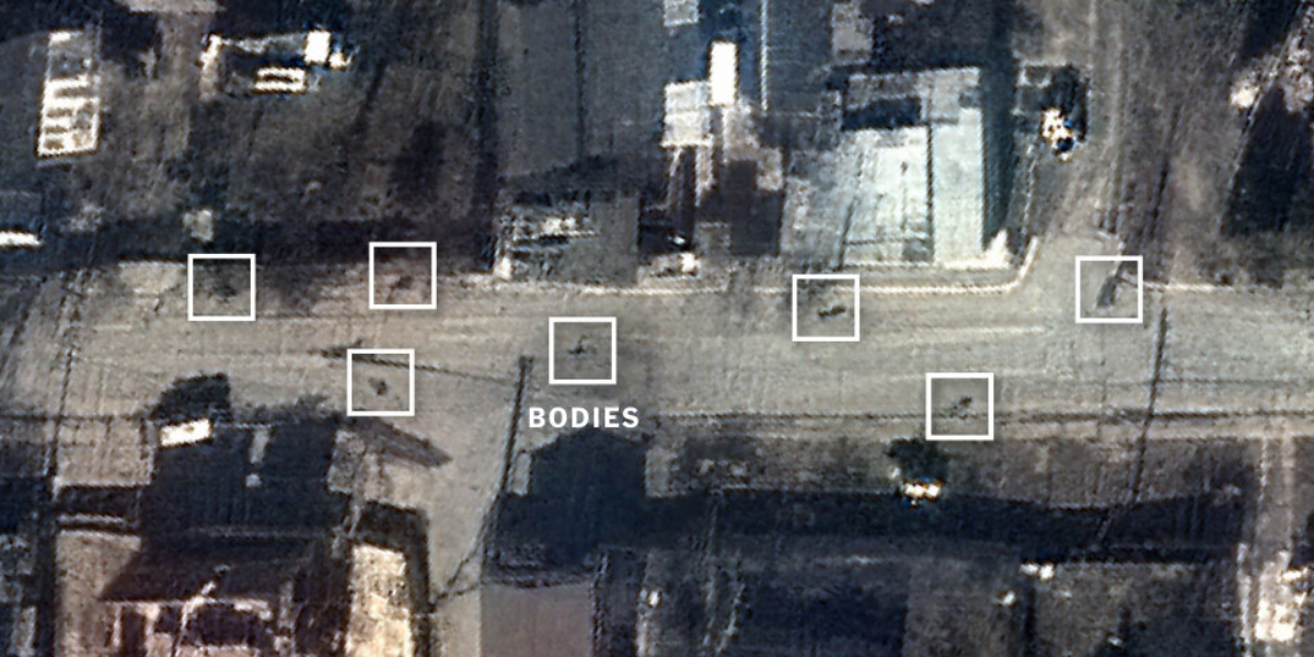 However, satellite photographs from Maxar from March 19 and 21 reveal many bodies on Bucha’s Yablonska street at the time.