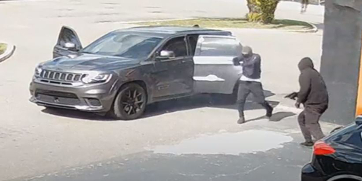 Three masked gunmen can be seen firing rounds into a car in broad daylight before fleeing the scene in a gray Jeep Grand Cherokee.
