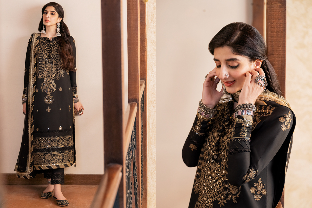 Mawra Hocane looked stunning in the traditional black dress for the photo shoot, which was for their new Eid Festive Collection. The dress was embellished with a heavy neckline, double borders, and motifs scattered throughout in two-toned antique gold zari and dull olive green thread, as well as glistening 5mm gold sequins.