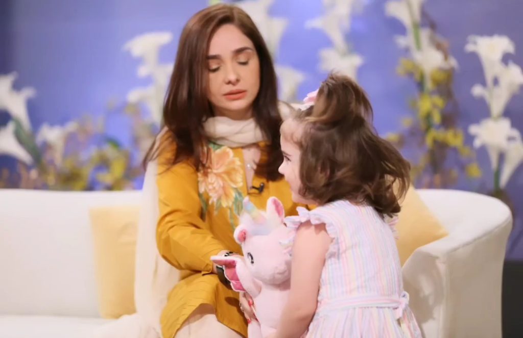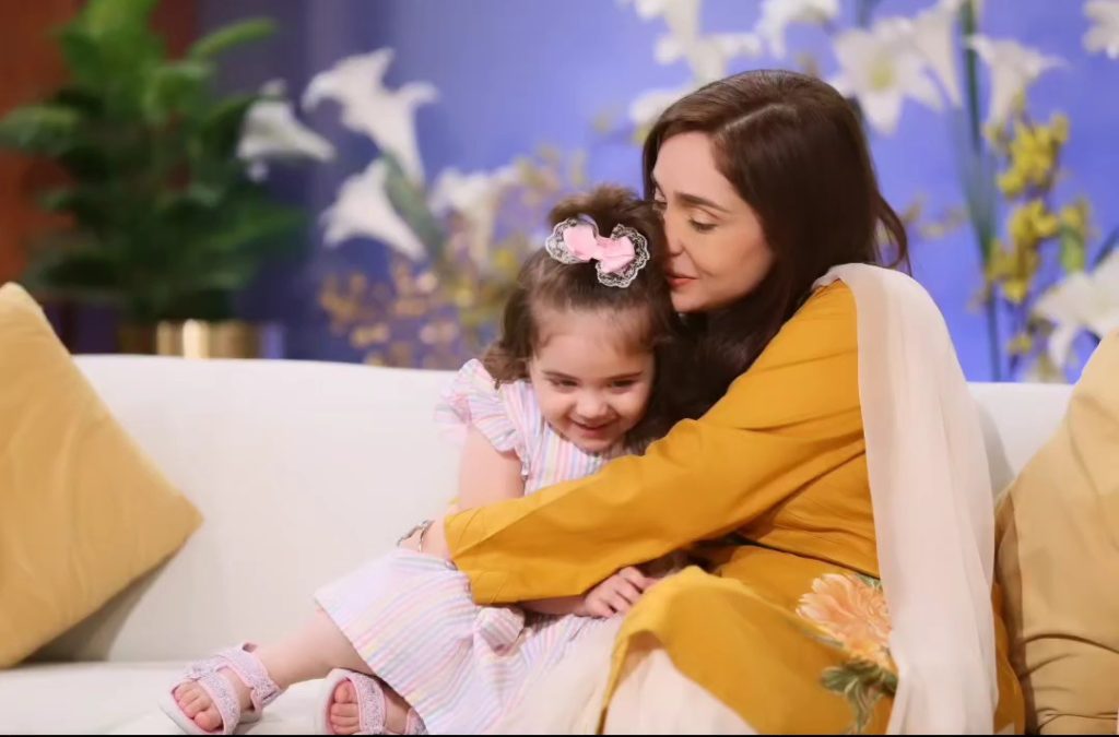 In addition to her acting career, Juggun hosts a morning show on PTV. One memorable day on set, her little one, Noorbano, decided to join her. Noorbano looked adorable in her striped frock, and both mother and daughter had a great time together. Juggun shared some heartwarming pictures of their time on set, and it’s hard not to fall in love with this charming mother-daughter duo.