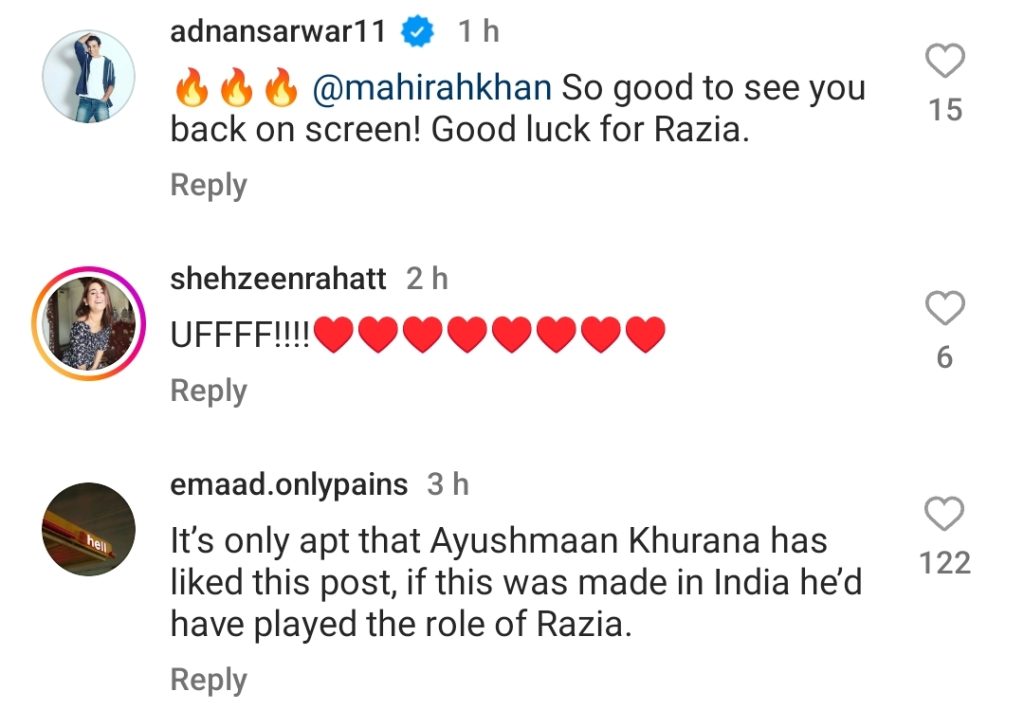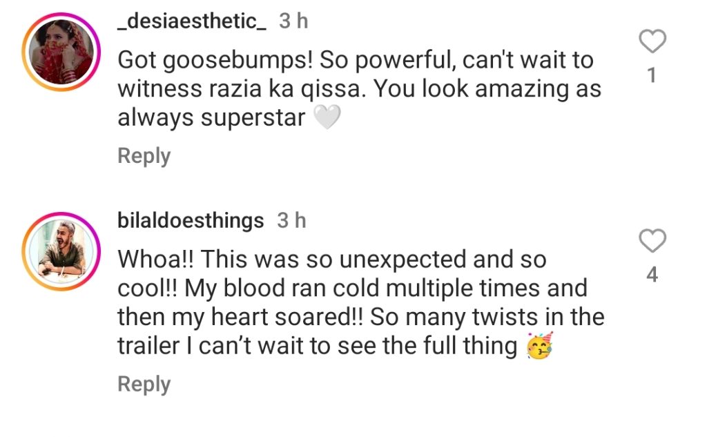 “Razia” is evoking strong emotions and thoughts. Mahira Khan’s impactful presence in the trailer has garnered widespread praise. Friends and fans alike are noting that Mahira’s performance is sending shivers down their spines. Her portrayal of Razia is endearing, with her traditional attire and braided hair adding to her charm.