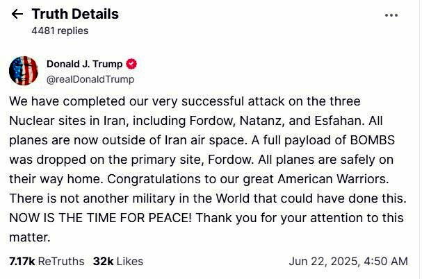 Despite the military action, President Trump declared, “Now is the time for peace,” urging Iran to agree to end the conflict. He also announced an upcoming address to the public following the strikes on Iranian nuclear facilities. While President Trump claimed the Fordow nuclear facility was “completely destroyed,” Fars News Agency contradicted this, reporting that the Fordow nuclear facility sustained “no significant damage” and that “most of the damage to Fordow was only to the ground, which can be restored.”