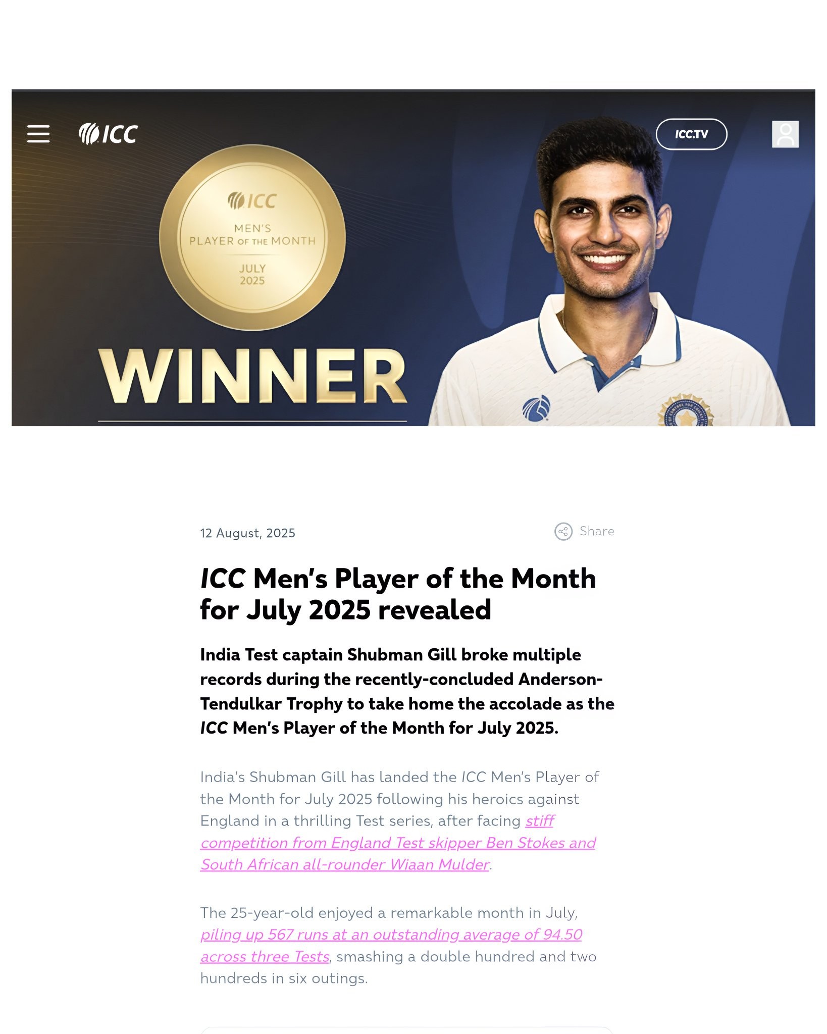 The International Cricket Council (ICC) announced on Tuesday, August 12, 2025, via an official media release and their digital platforms, that the award, headquartered in Dubai, United Arab Emirates, recognized his stellar performance during the recent Test series against England.
