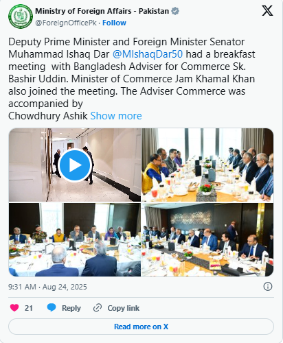 Dhaka: Deputy Prime Minister and Foreign Minister Senator Muhammad Ishaq Dar had a breakfast meeting with Bangladesh Adviser for Commerce Sk. Bashir Uddin, that aimed at enhancing bilateral economic ties between two countries.