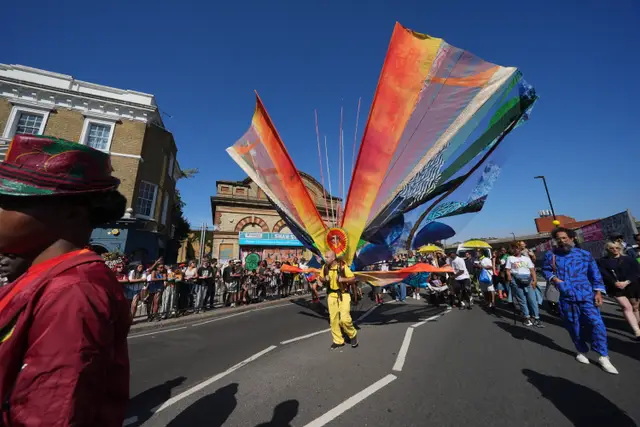 A mixture of adults and children adorned in jewels, glittery wings, belts and headdress danced and leapt down the street followed by floats pumping out bass and music in West London on Sunday.