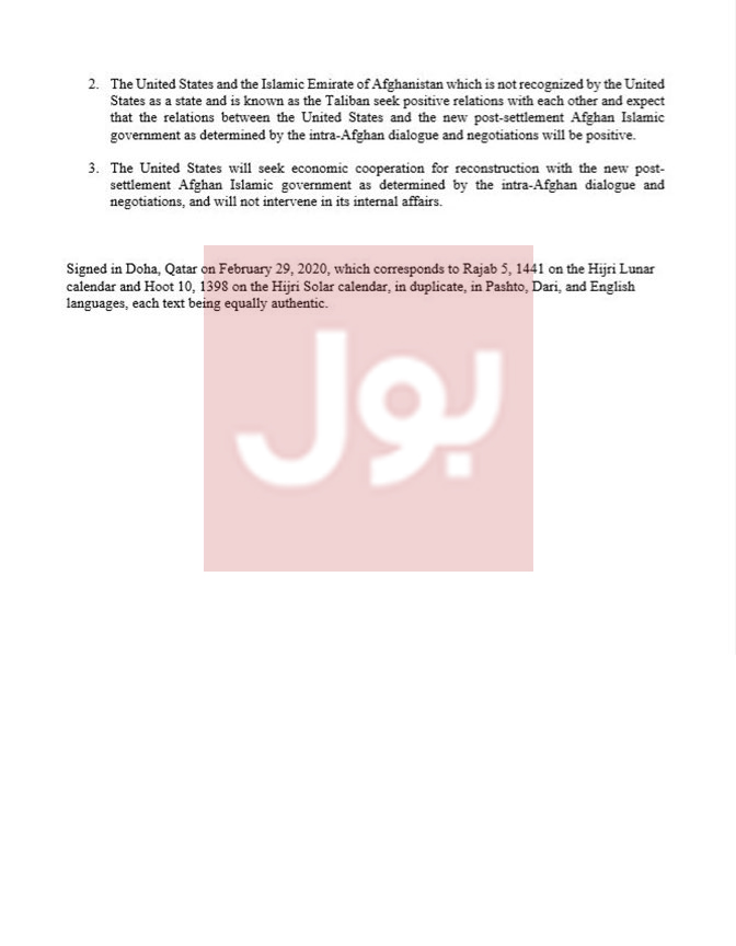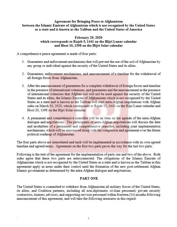 The press release issued after the signing ceremony guarantees the timely evacuation of US and allied forces from Afghanistan. the agreement also guarantees that Afghan soil will not be used against United States and its allies.