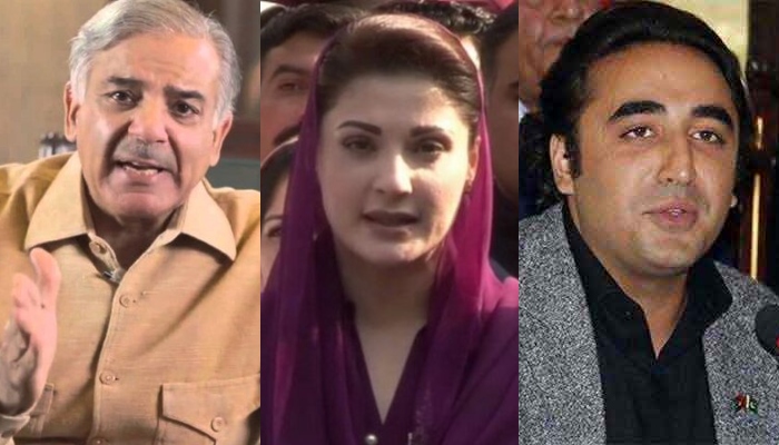 PML-N President Shehbaz Sharif (Left), PML-N Vice-President Maryam Nawaz (Centre), and Pakistan Peoples Party (PPP) Chairman Bilawal Bhutto Zardari (Right). Image: File