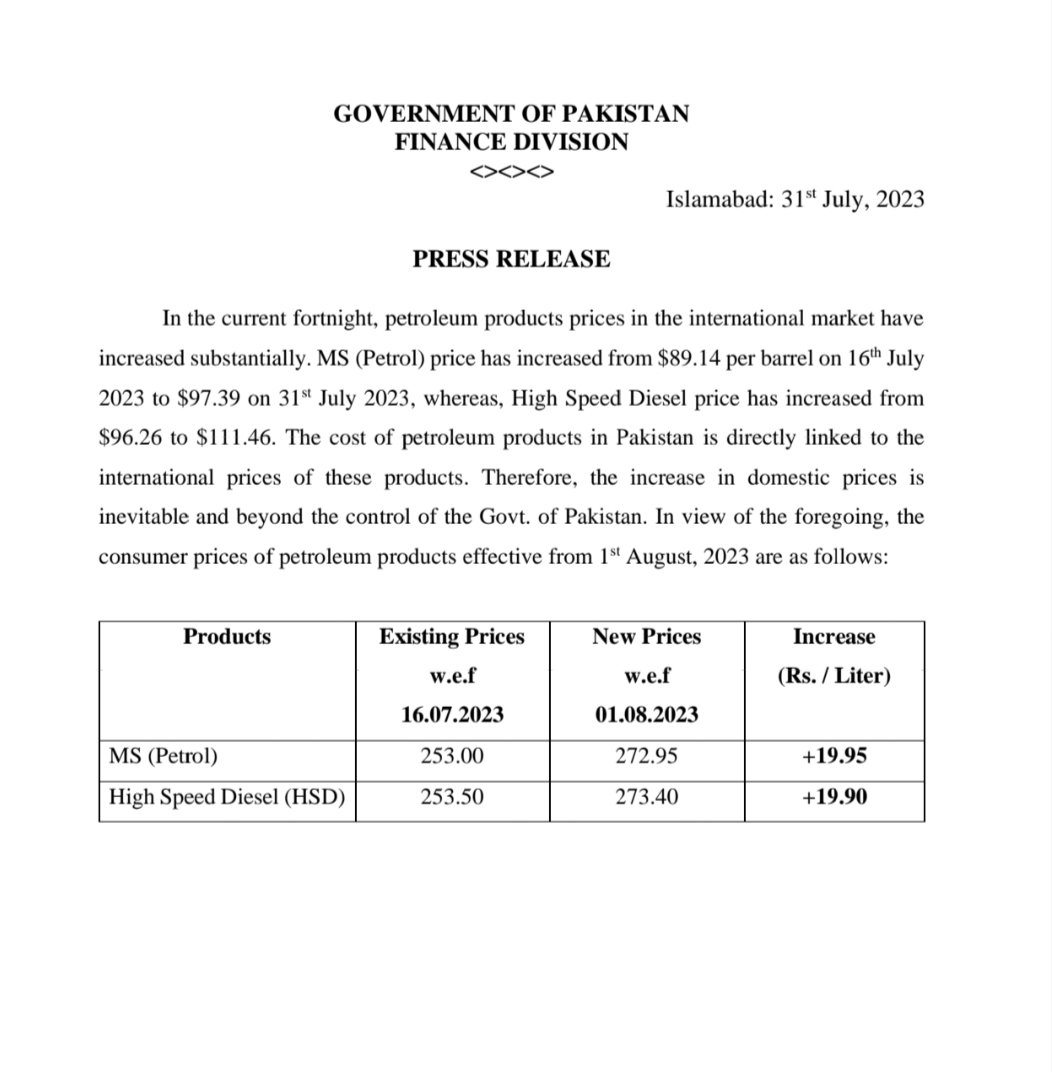 “The cost of petroleum products in Pakistan is directly linked to the international prices of these products. Therefore, the increase in domestic prices is inevitable and beyond the control of the Govt. of Pakistan. In view of the foregoing, the consumer prices of petroleum products are effective from 1st August, 2023,” read a notification issued by the Ministry of Finance.