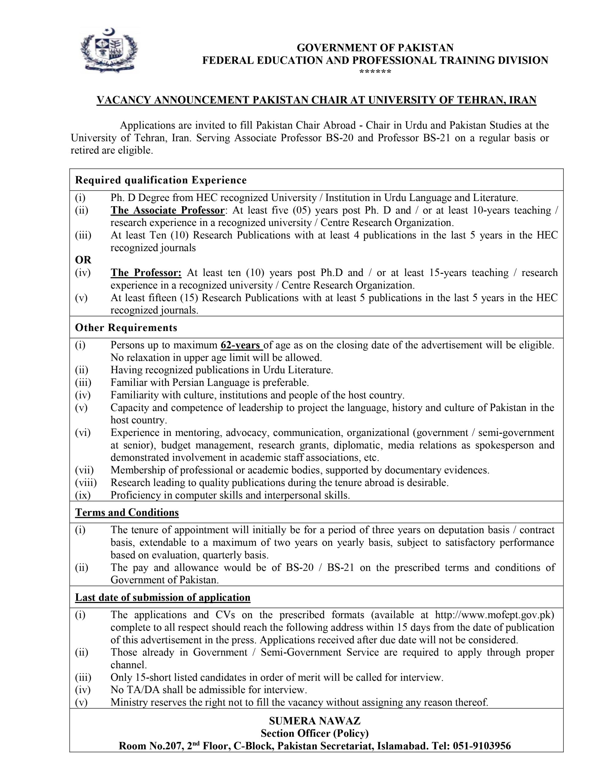 The Ministry of Federal Education and Professional Training (MOENT) in Tehran, Iran, is inviting applications from highly qualified individuals for the prestigious position of Chair, as recently advertised in the Newspaper on September 3, 2023.