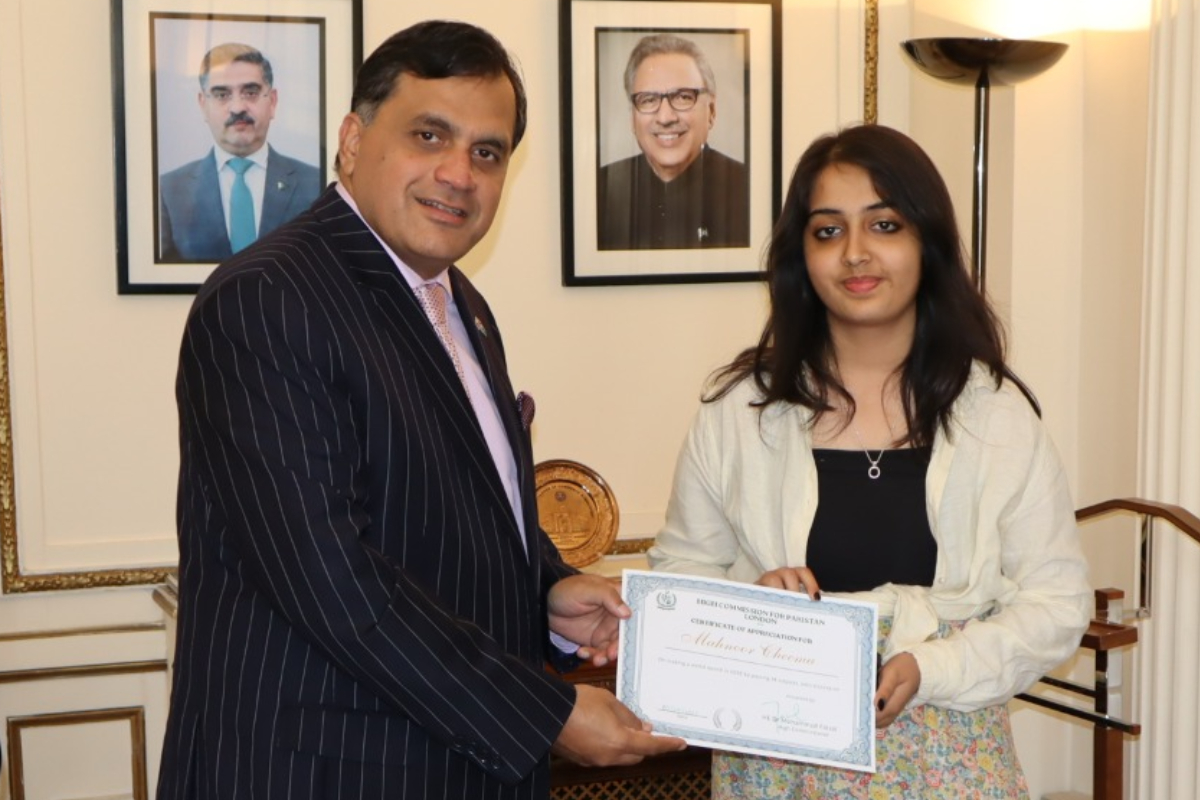 Pakistan envoy presents `Certificate of Appreciation’ to exceptional GCSE achiever Mahnoor Cheema