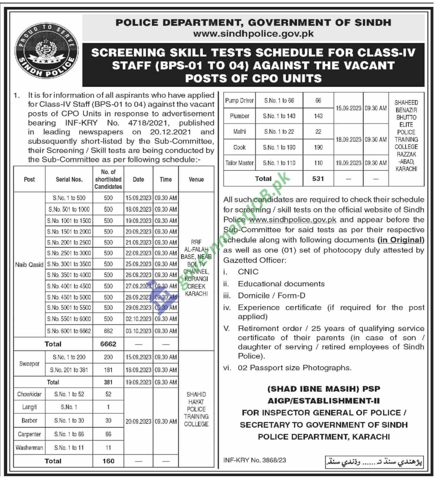- Sindh Police to hold screening/skill tests for Class-IV Staff positions (BPS-01 to 04) on September 15, 2023.