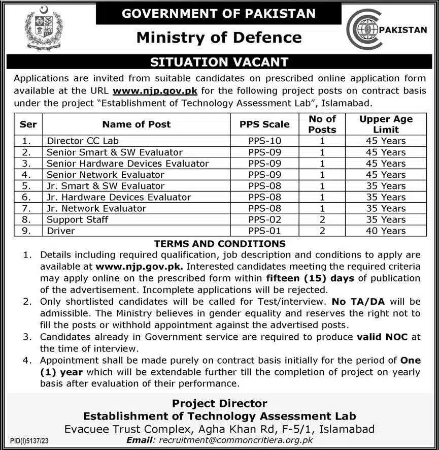 The Ministry of Defense in Islamabad has revealed several job vacancies for different roles as part of the “Establishment of Technology Assessment Lab” project. These positions are offered on a contract basis, and individuals keen on applying are encouraged to submit their applications online via the official website.