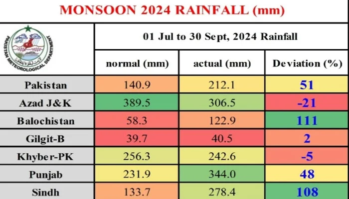 The Met Office provided a breakdown of rainfall across provinces, highlighting that Balochistan saw the largest surge, with a 111% increase in rainfall, recording 122.9mm compared to the usual 58.3mm from July 1 to September 30.