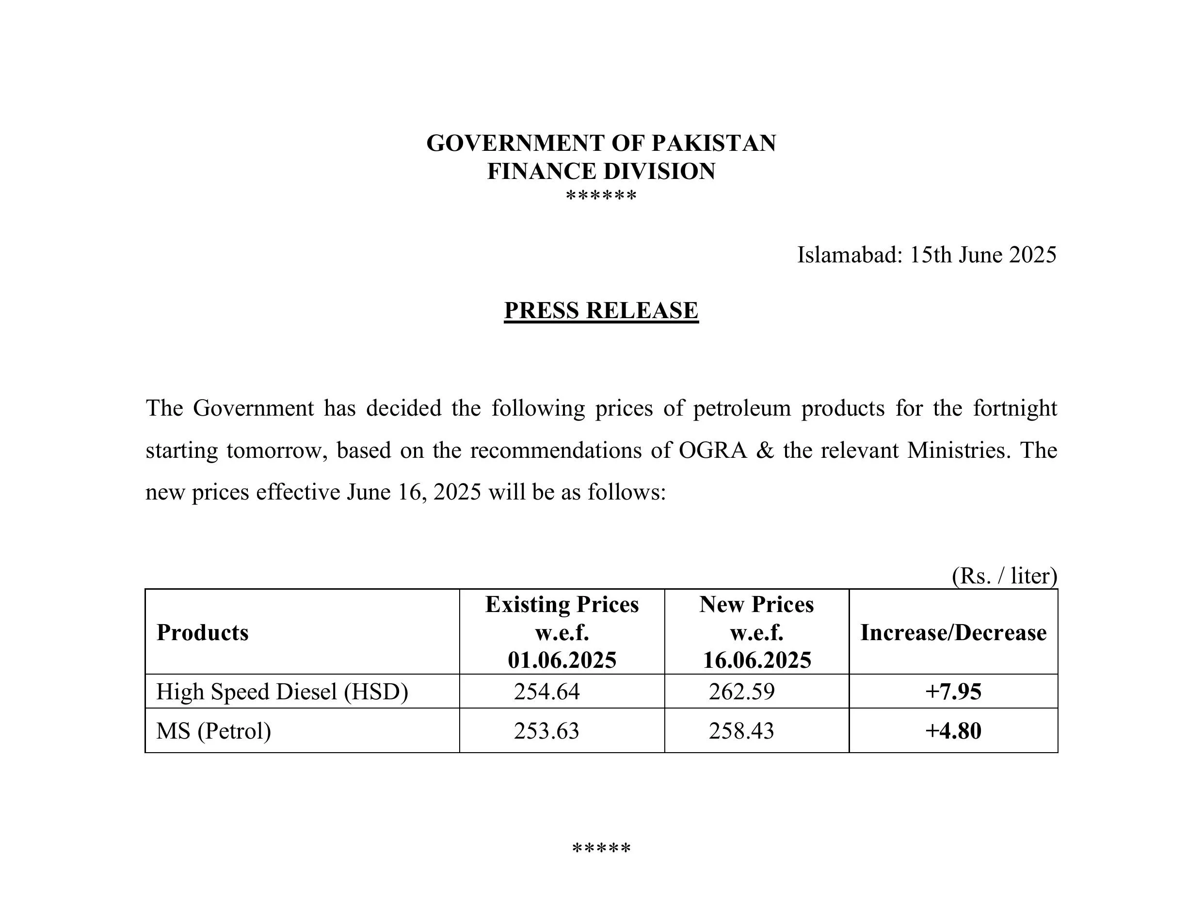 The rate for high-speed diesel was also surge by Rs7.95 per litre, raising it to Rs258.43 from Rs253.63 per litre.