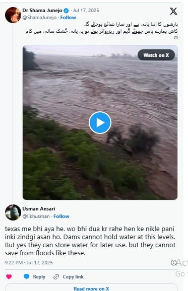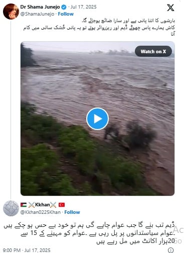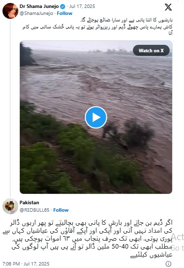 کاش ہمارے پاس چھوٹے ڈیم اور ریزروائر ہوتے تو یہ پانی خُشک سالی میں کام آتاAdvertisement— Dr Shama Junejo (@ShamaJunejo) July 17, 2025