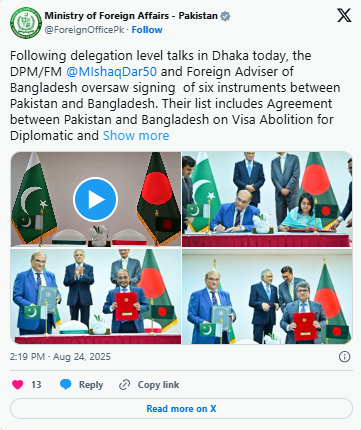 The signing ceremony of the Memorandums of Understanding was held under the supervision of Deputy Prime Minister Ishaq Dar and Bangladesh’s Advisor for Foreign Affairs, Mohammad Hasan Touhid.