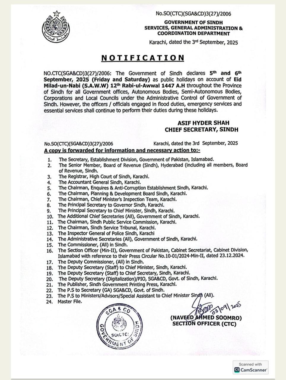 Sindh government has announced two consecutive holidays on September 5 and 6.