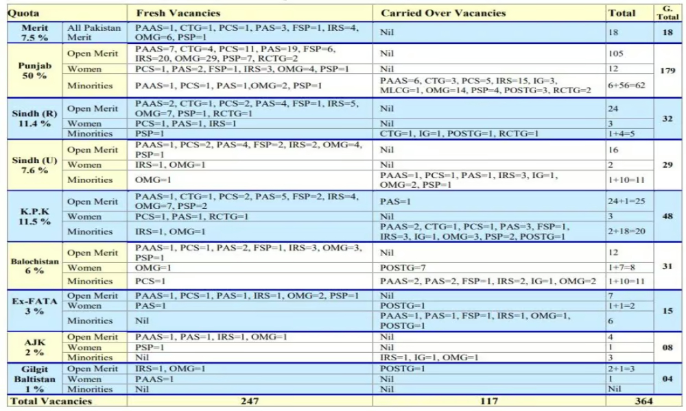 According to the FPSC, the vacancies include 247 new positions and 117 carried over from previous years. Of these, 214 seats are for open merit, 32 are reserved for women, and 118 for minorities.