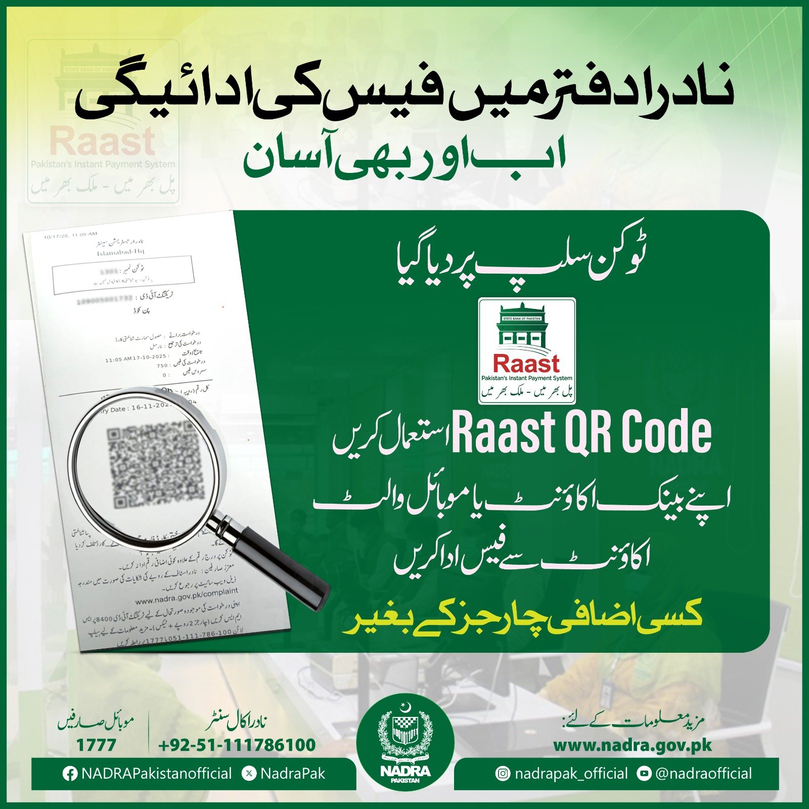 In a social media post, NADRA announced, “Paying fees at NADRA offices is now easier than ever. Simply scan the Raast QR code on your token slip to pay directly from your bank account or mobile wallet — with no extra charges.”