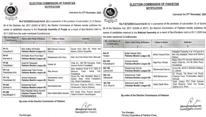 ISLAMABAD: The Election Commission of Pakistan (ECP) has issued notifications for candidates who won in recent by-elections, covering 5 National Assembly (NA) seats and 7 Provincial Assembly (PA) seats.