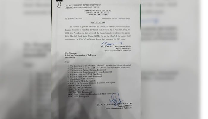 According to the notification, Field Marshal Syed Asim Munir has been appointed for a tenure of five years.