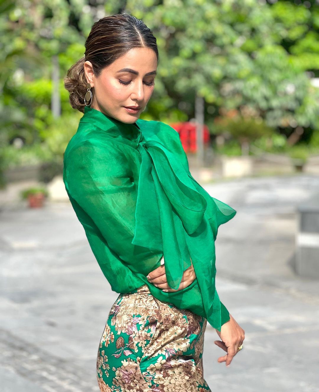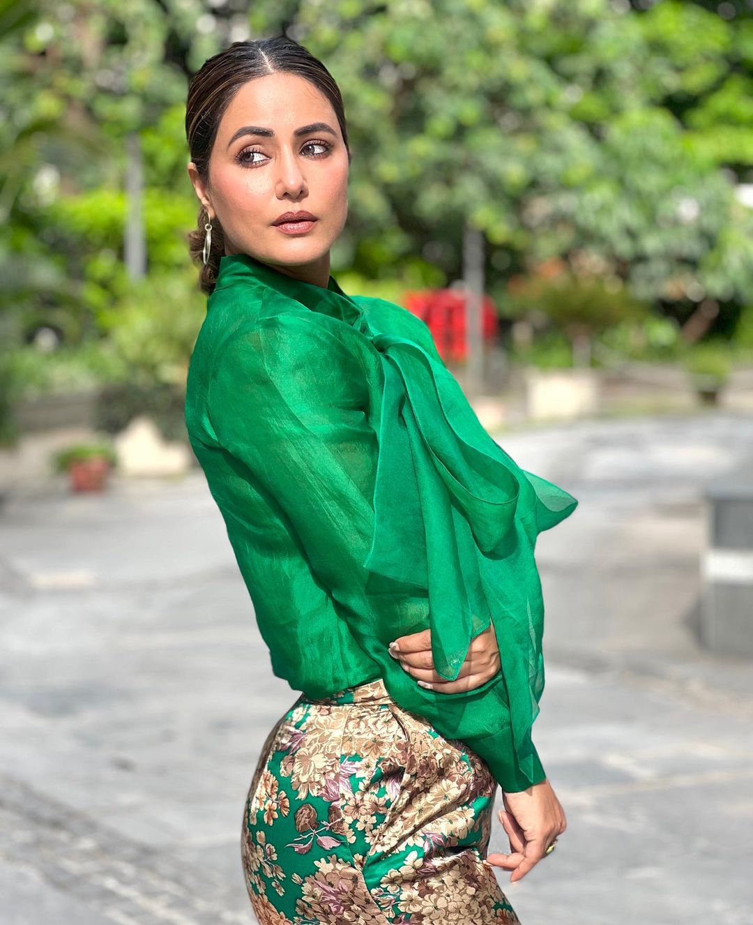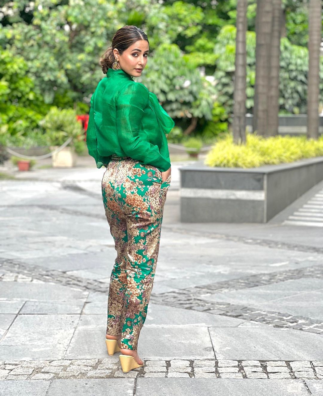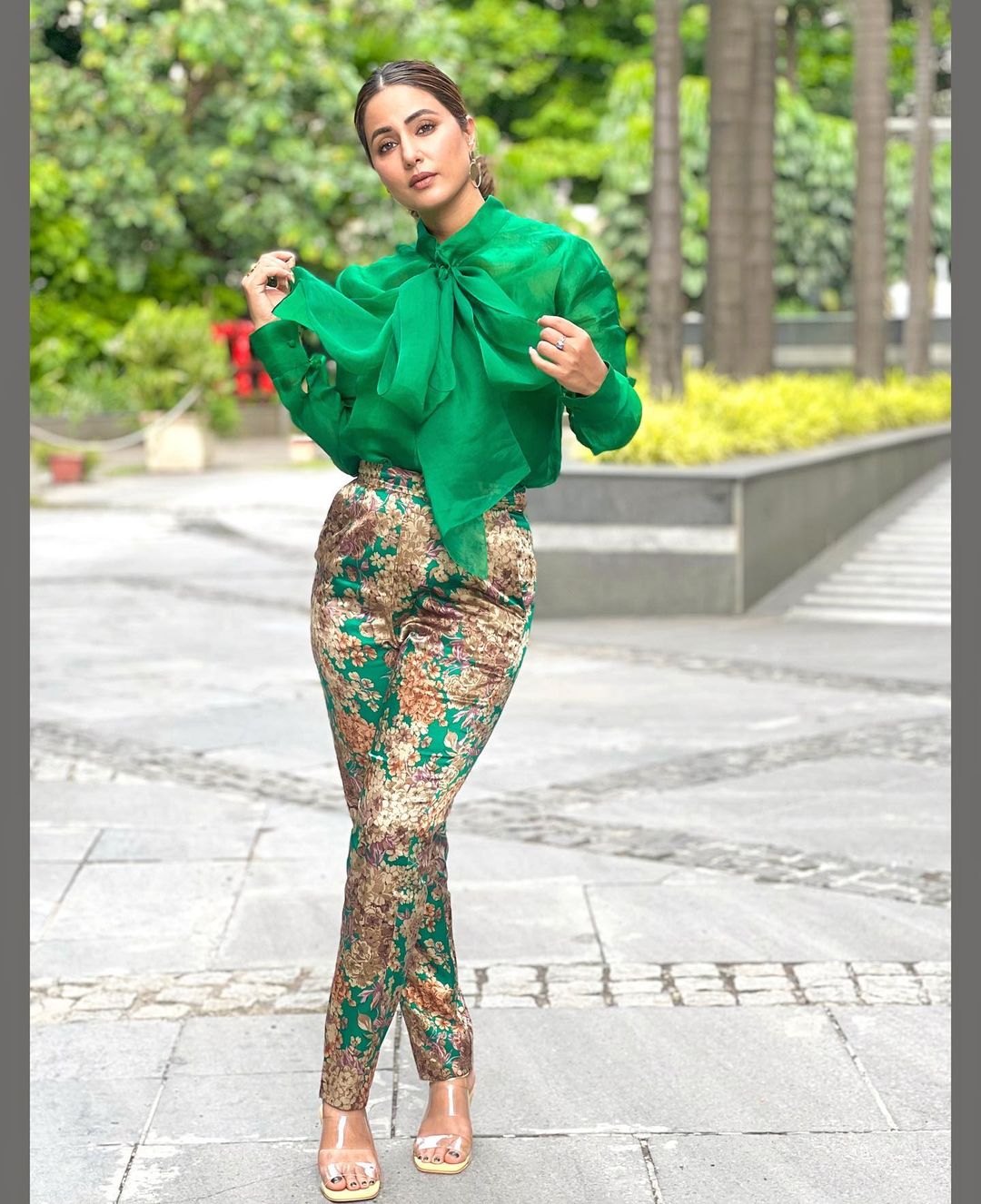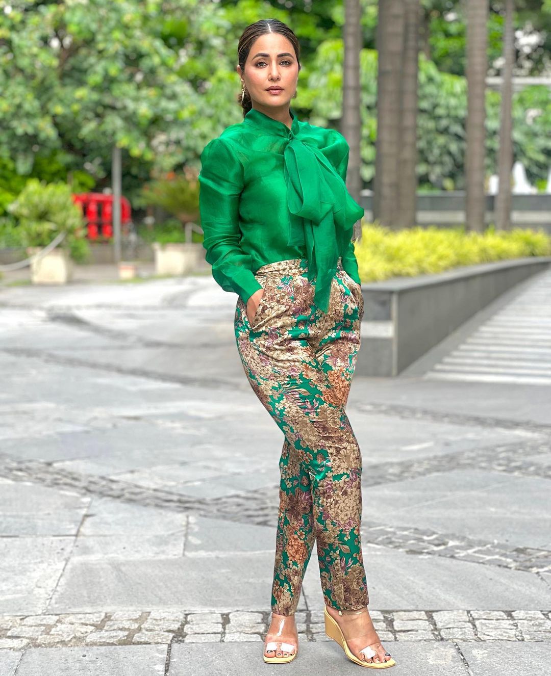 Hina Khan wearing bright green shirt with printed pants ; See Photos