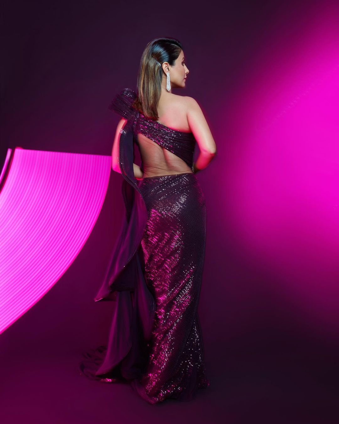Hina Khan looks absolutely stunning in aubergine saree outfit designed by Gaurav Gupta. She amazed her fans with her latest look.