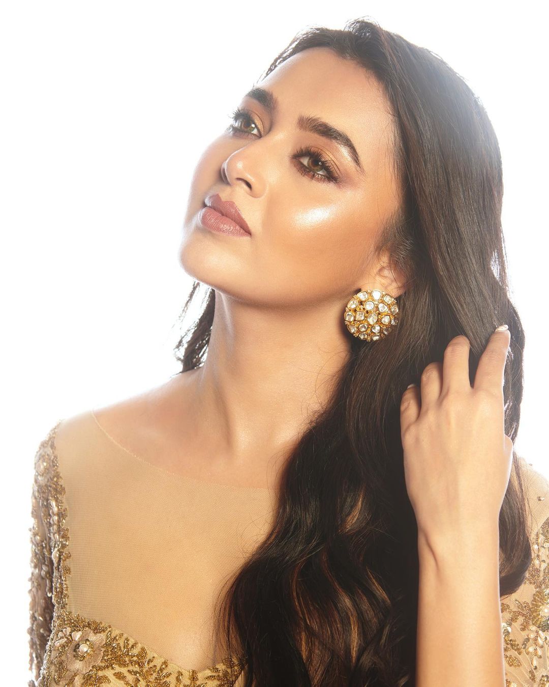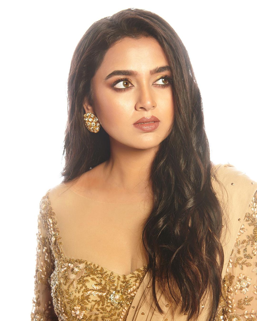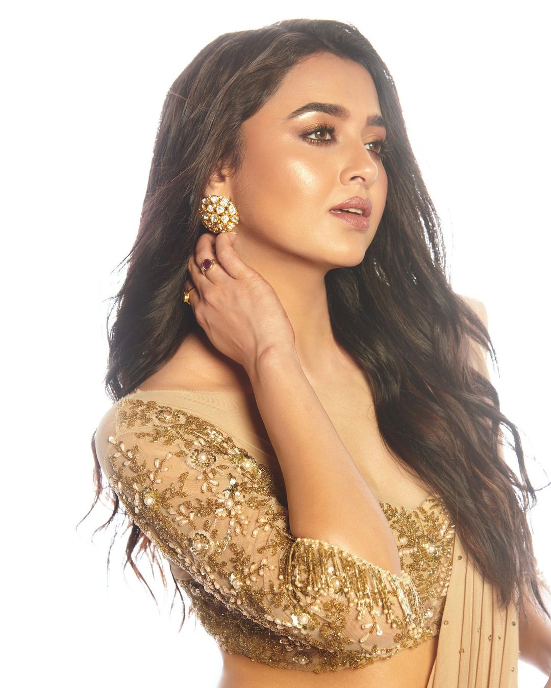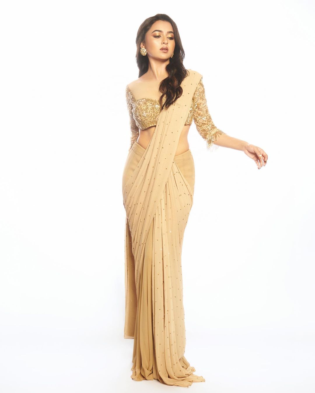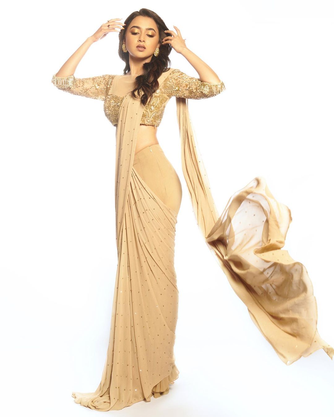 Tejasswi Prakash slaying in pre-draped beige golden saree