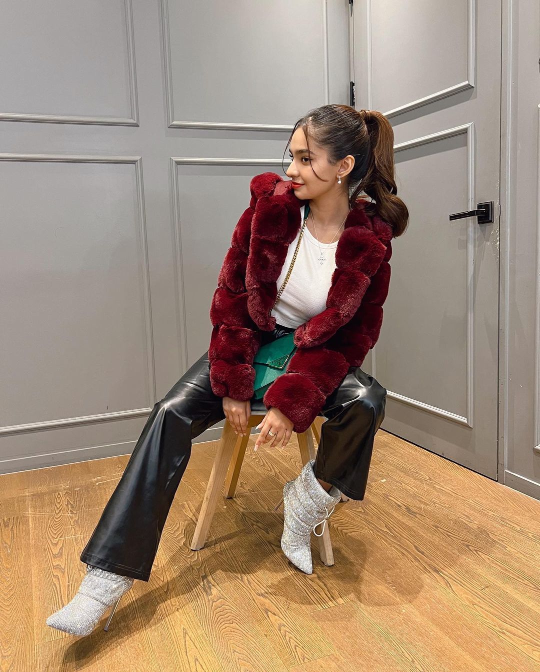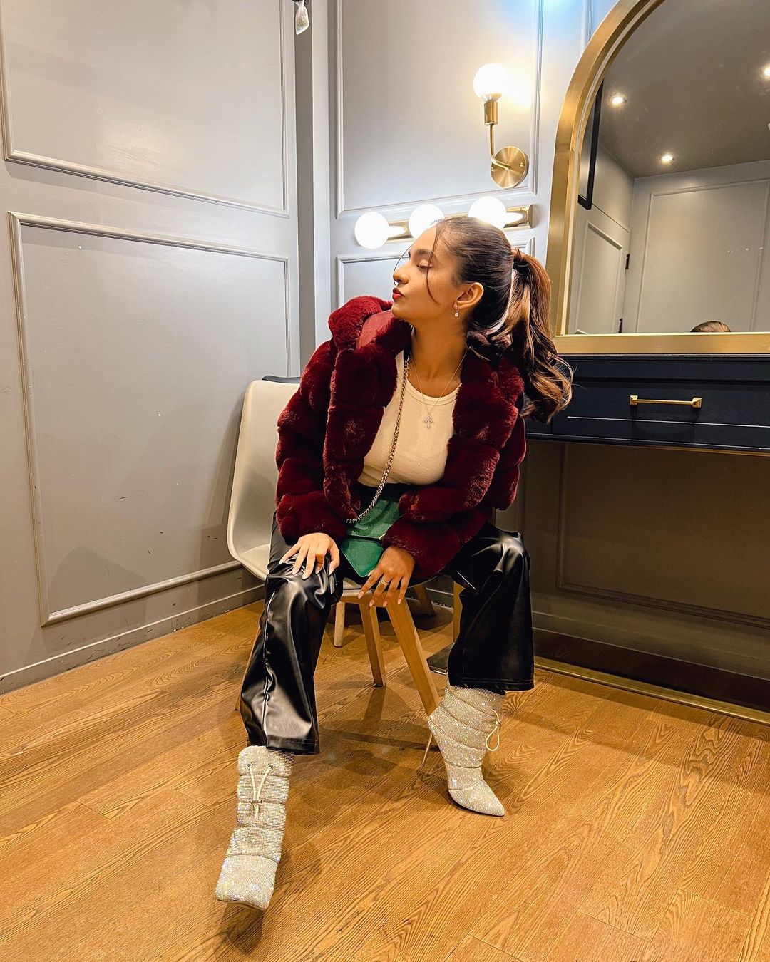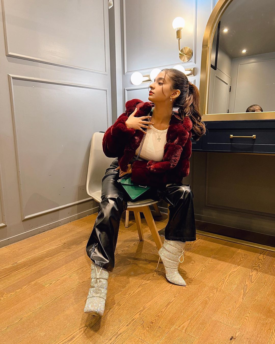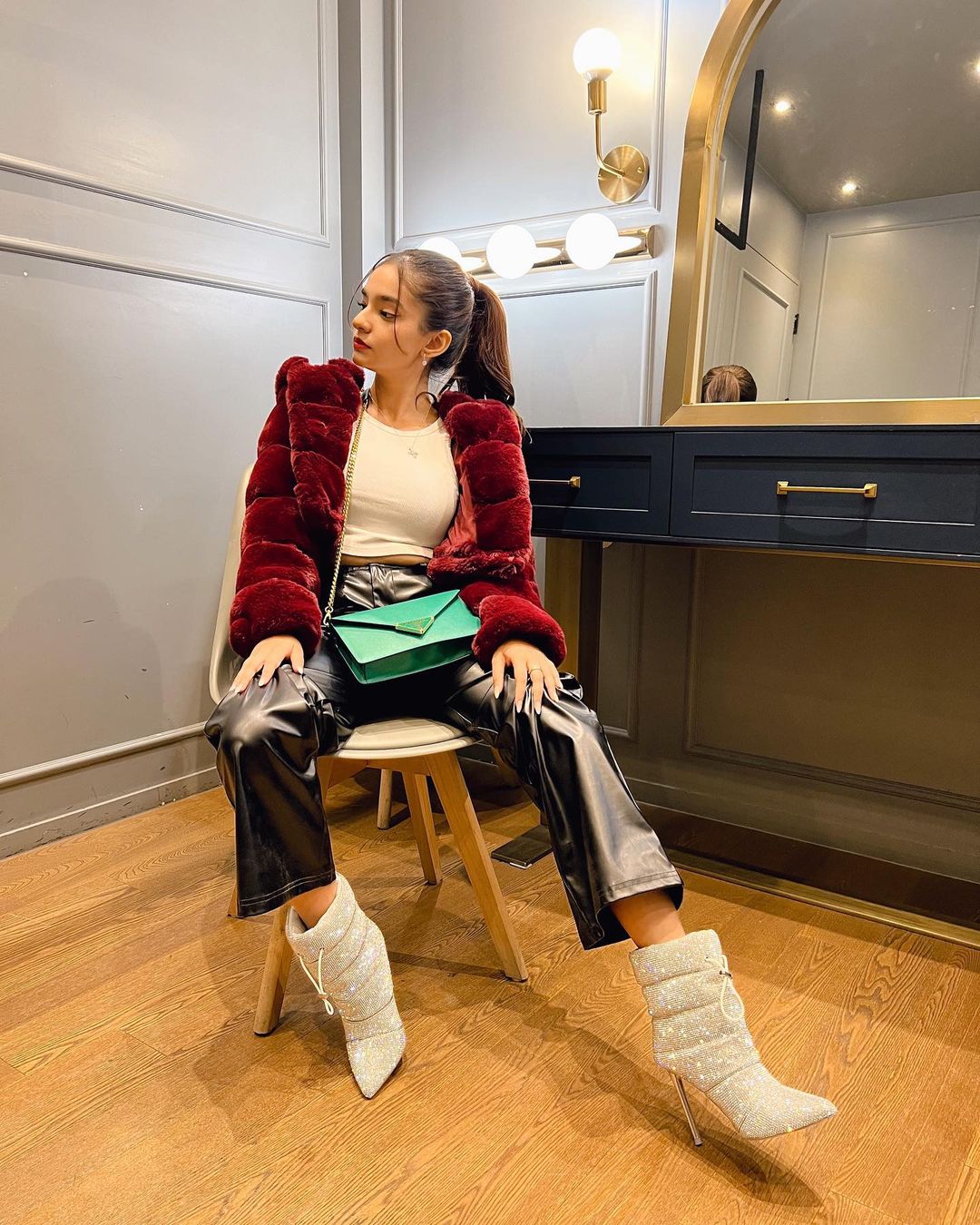 Anushka Sen is an Indian television actress and model. Recently, she took her Instagram handle and posted her pictures in this cool outfit which she paired with red fluffy jacket and white shoes.