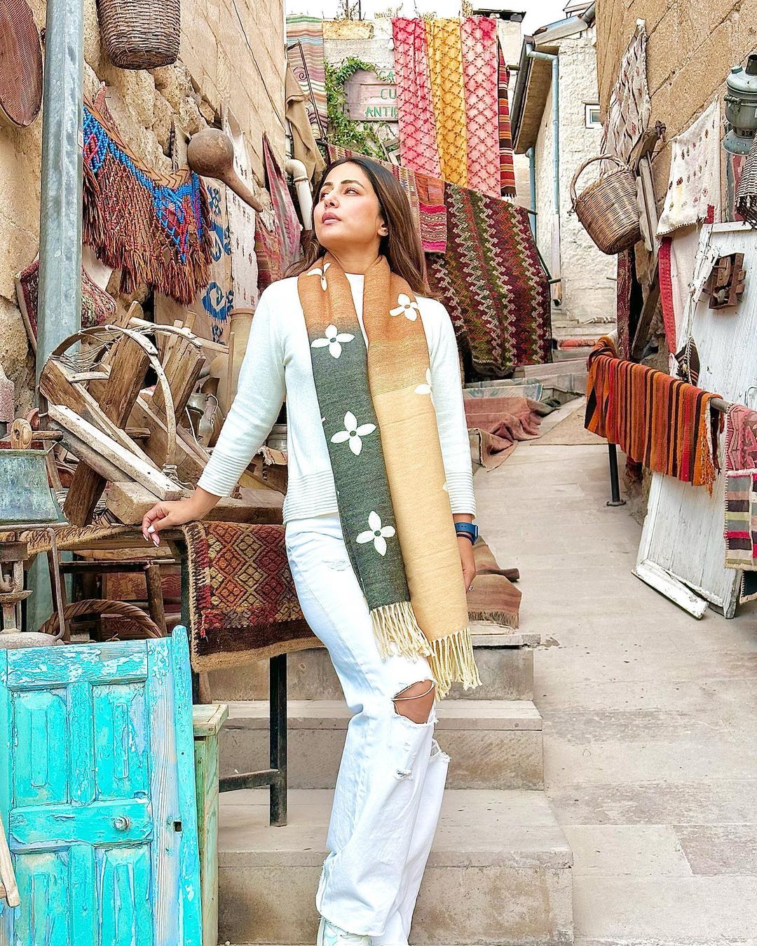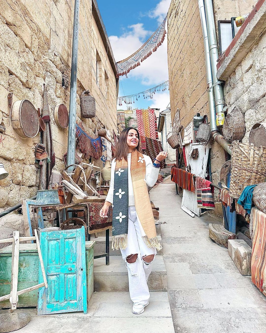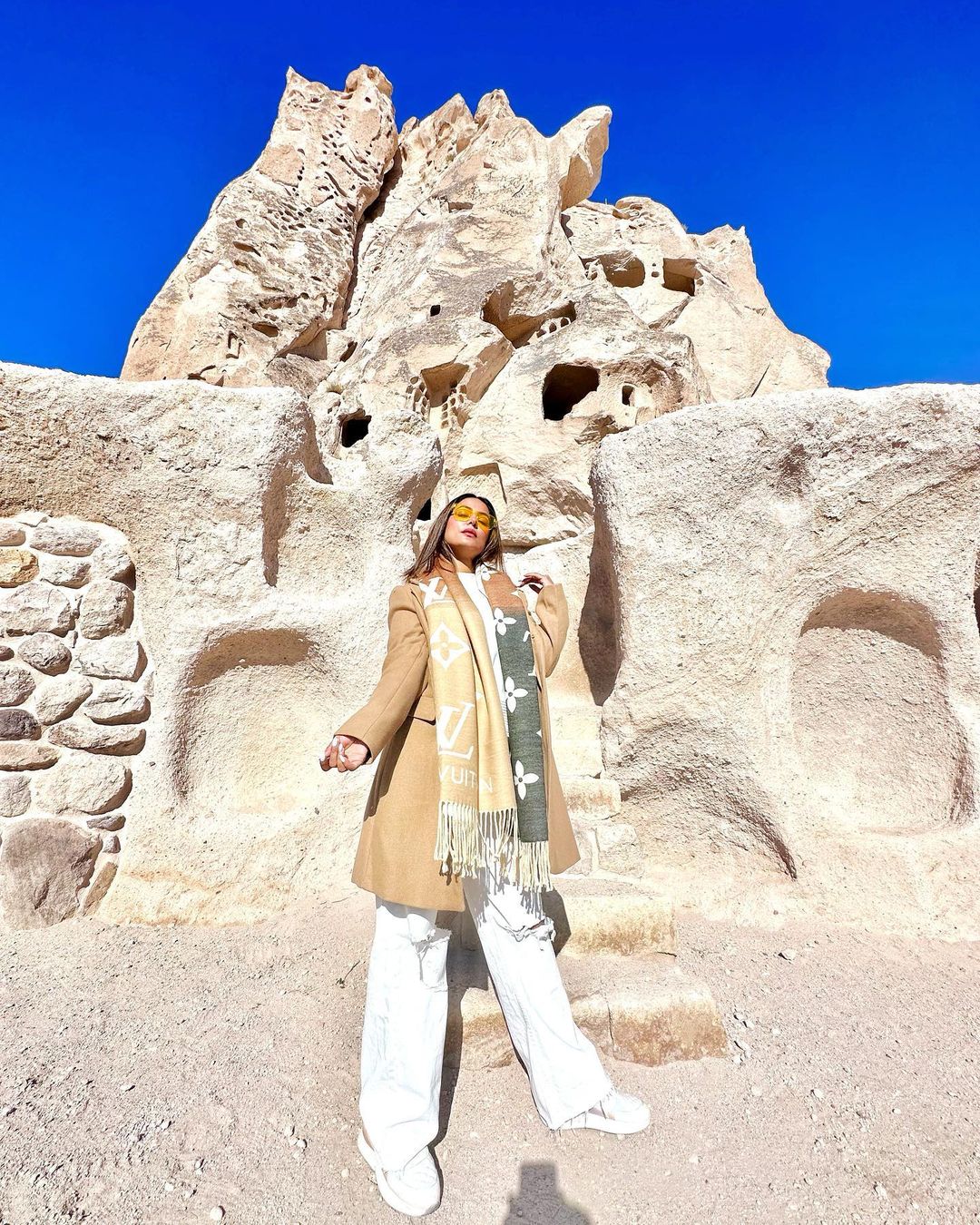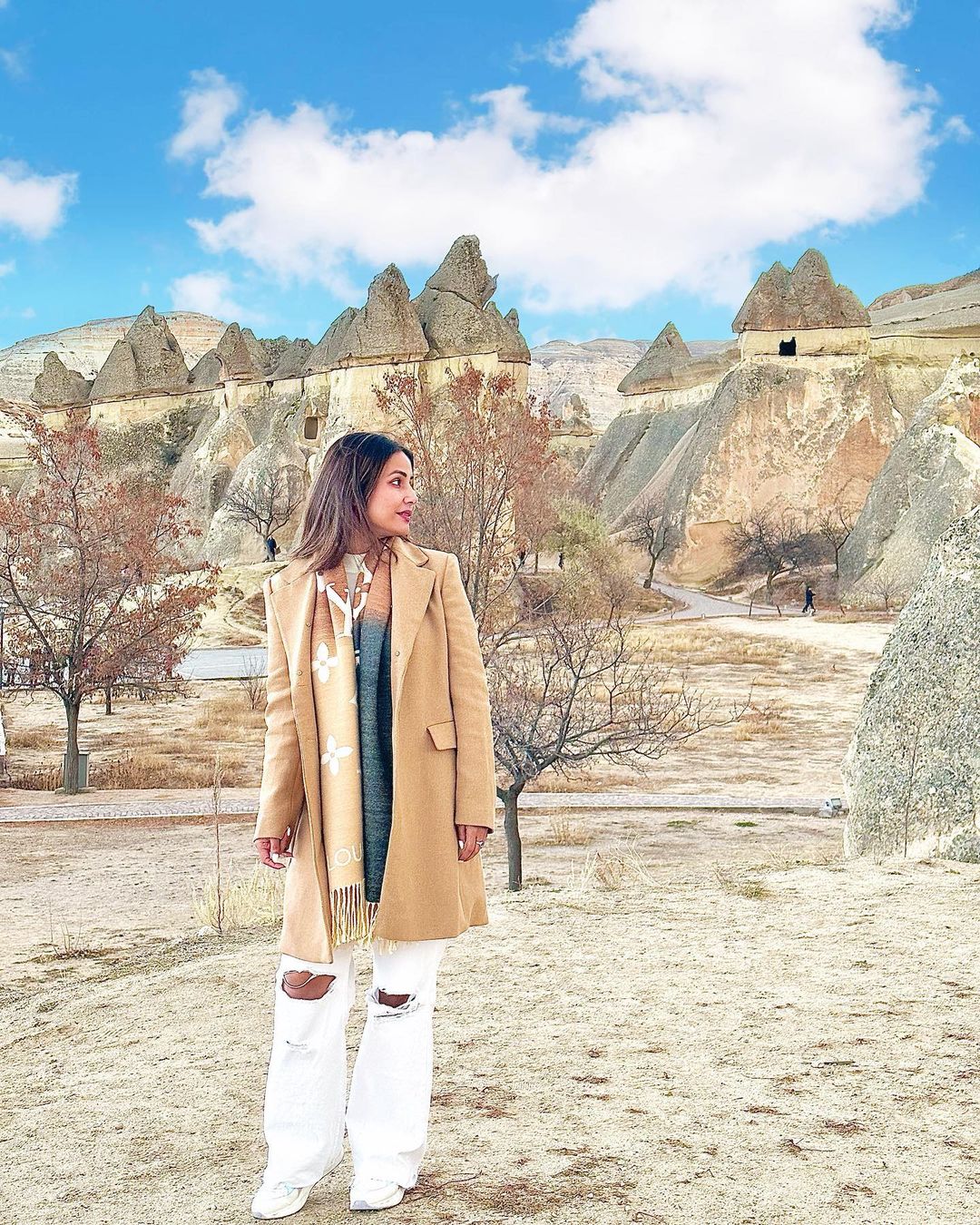 Hina Khan is touring Turkey and giving everyone major fashion aspirations. Check out her style collection. In white ripped pants and a top she paired with a beige overcoat, she looked stunning as she blended in with Turkey’s picturesque stone formations. However, the Louis Vuitton scarf is the centre of attention right now.