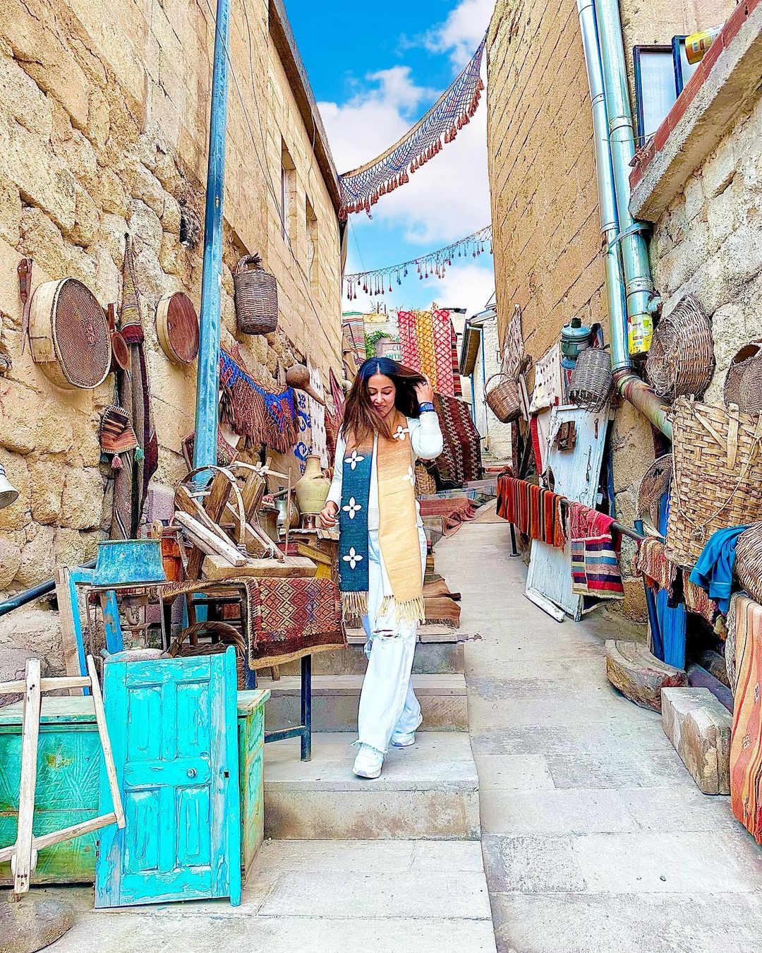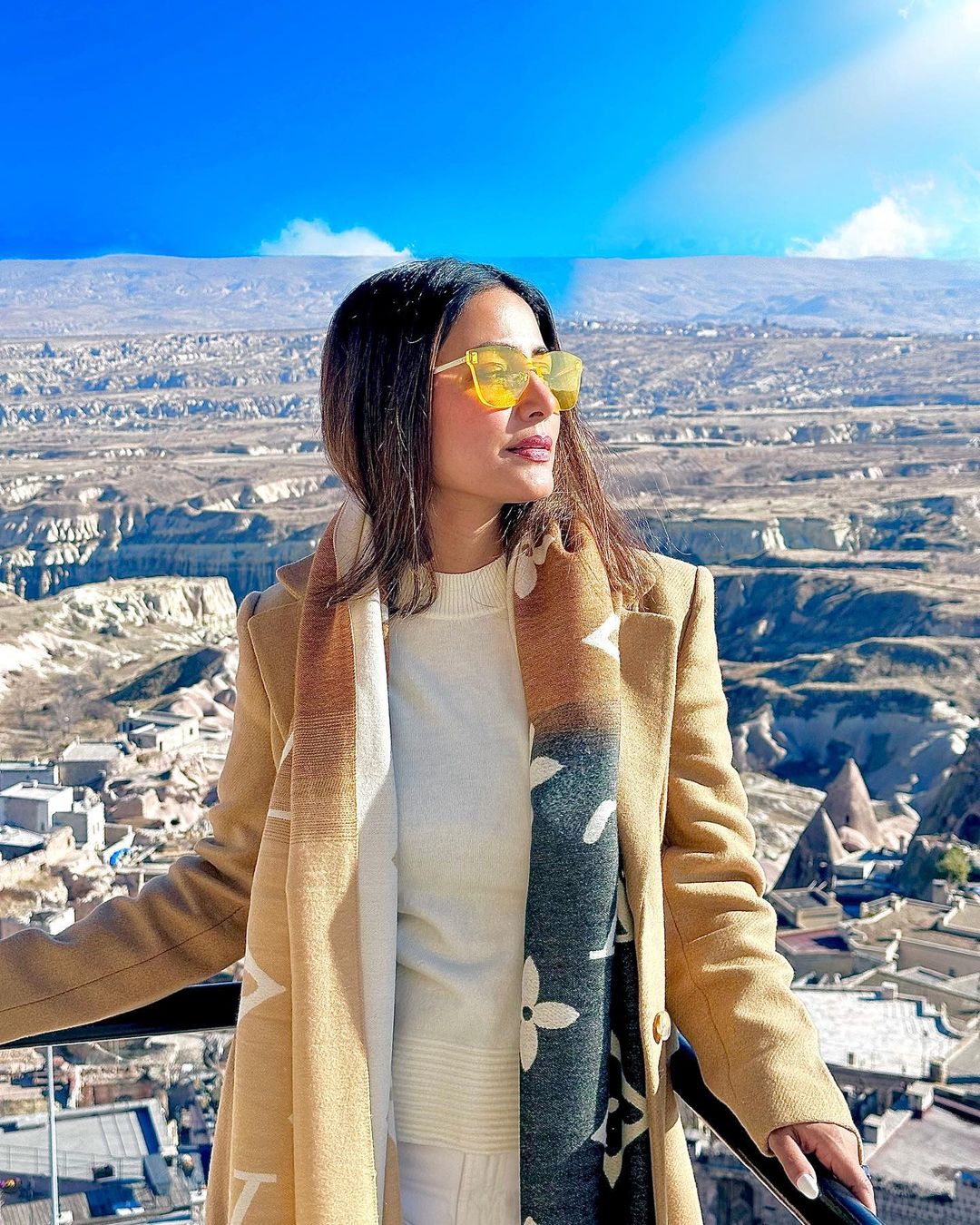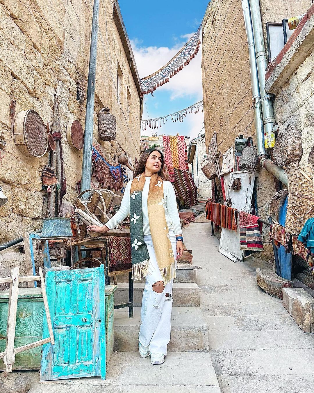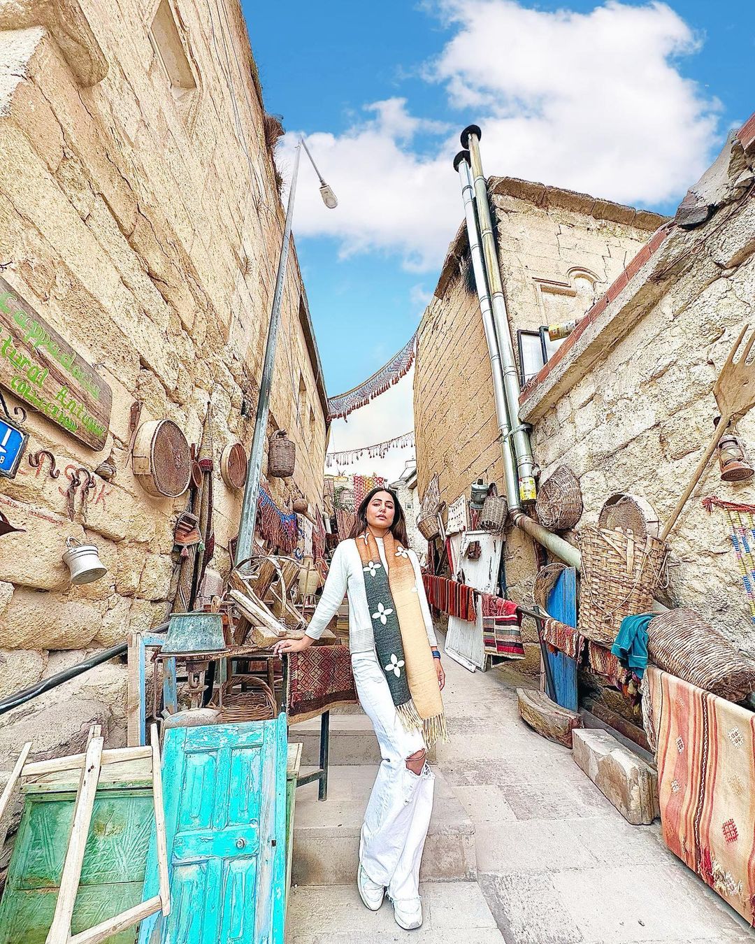 Hina Khan is touring Turkey and giving everyone major fashion aspirations. Check out her style collection. In white ripped pants and a top she paired with a beige overcoat, she looked stunning as she blended in with Turkey’s picturesque stone formations. However, the Louis Vuitton scarf is the centre of attention right now.