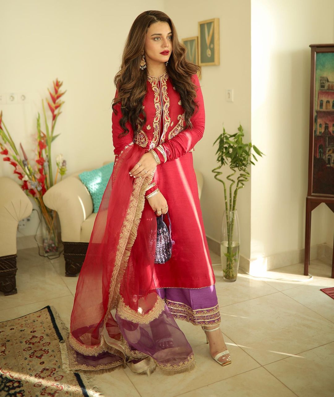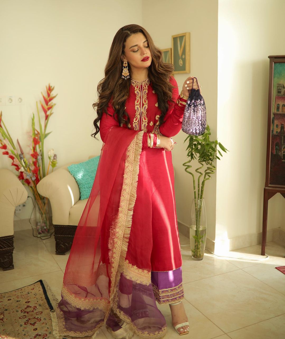 The actress wowed in red. Abbas wore a red outfit for Eid. Berry red, gold, and purple were used. The gold-and-red outfit has an embroidered jacket.